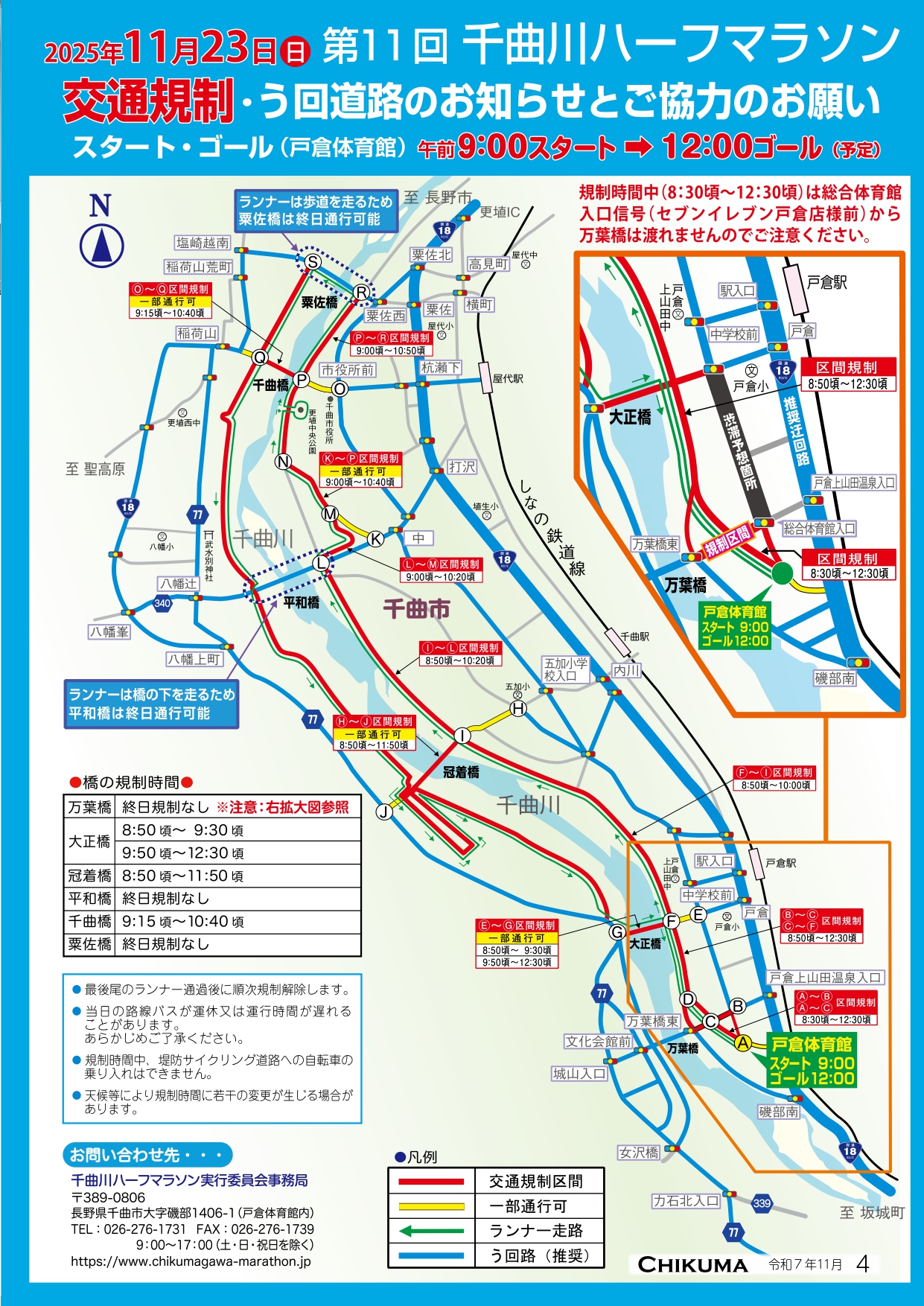 交通規制のお知らせとご協力のお願い 2025.10.31 最終更新日時 : 2025.10.31 千曲川ハーフマラソン実行委員会 大会当日は交通規制が実施されます。 皆様には大変ご迷惑をお掛けいたしますが、ご協力をお願いいたします。 交通規制図